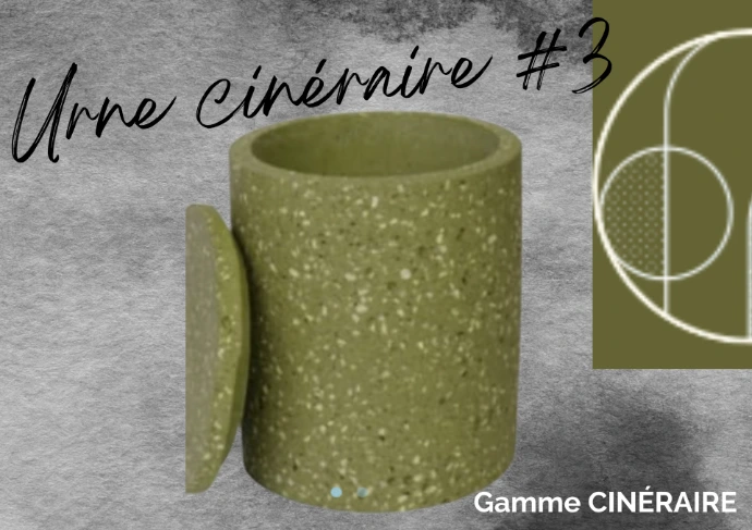 L’urne cinéraire n°3 se distingue par sa teinte vert doux, mouchetée de nuances plus claires, qui évoque la nature, les jardins et la sérénité. Sa forme cylindrique épurée, surmontée d’un couvercle assorti, offre une silhouette simple et rassurante, idéale pour un hommage discret et empreint de douceur.